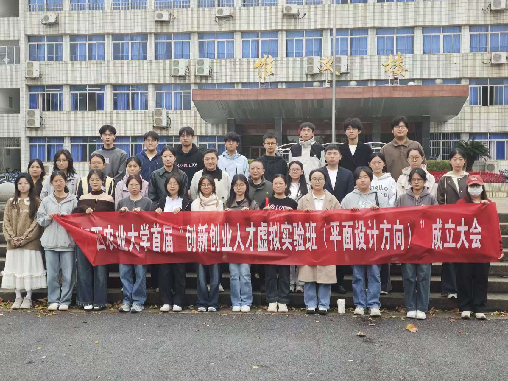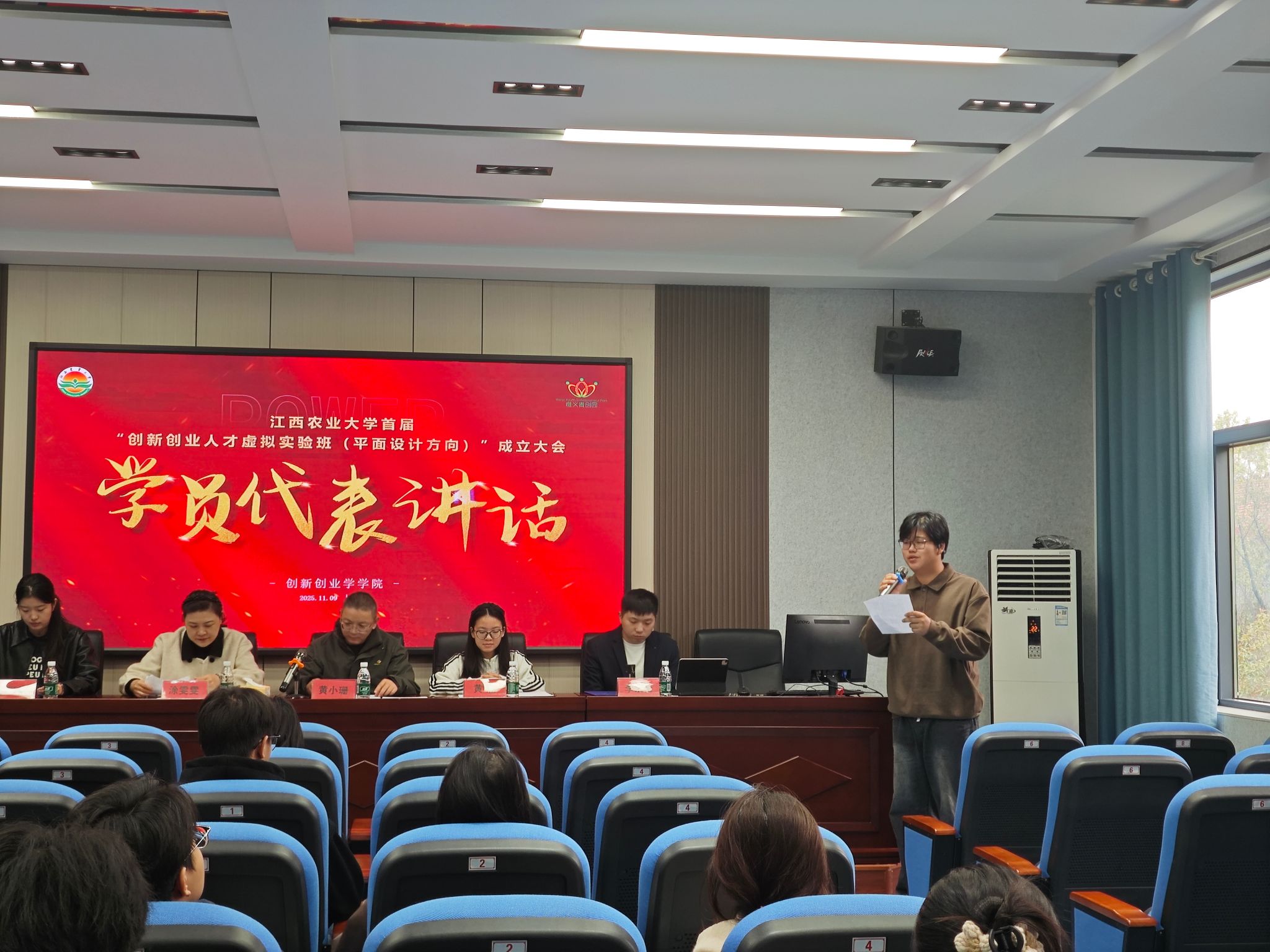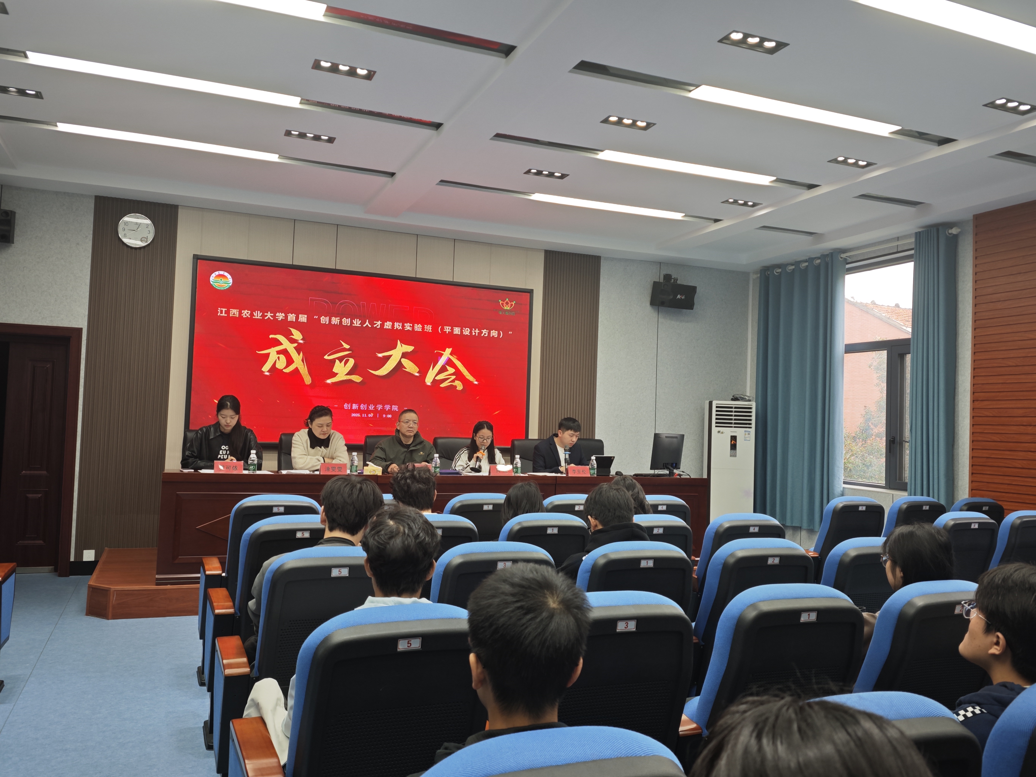 2025年11月9日上午,江西农业大学“创新创业人才虚拟实验班(平面设计方向)”成立大会圆满举行。创新创业学院院长黄小珊、实验班班主任涂雯雯、执行班主任黄雁及惟义青创社社长罗可依、首批学员和部分惟义青创社成员参会。