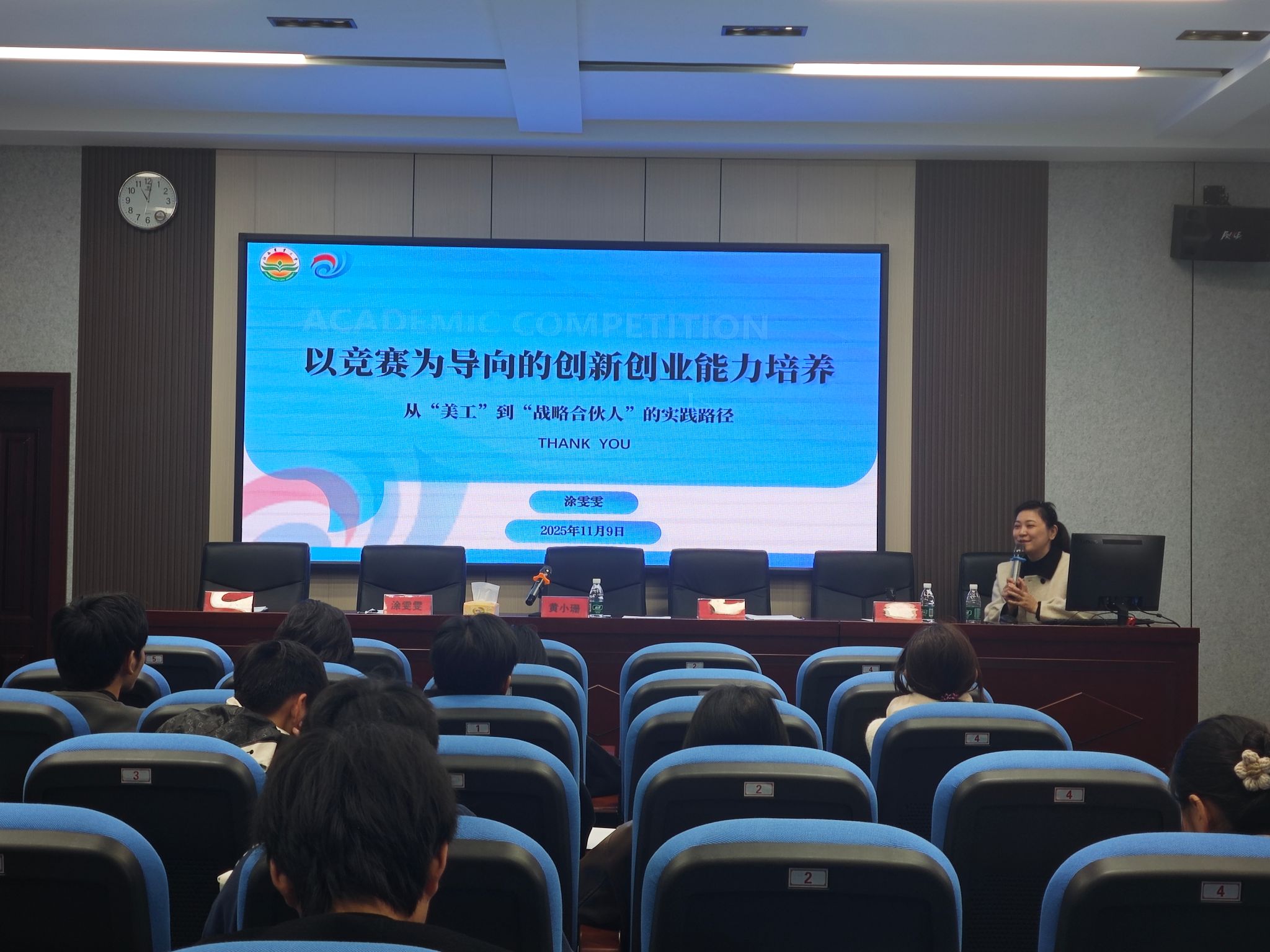 在全体与会人员合影留念后,班主任涂雯雯便开始了《从“美工”到“战略合伙人”的实践路径》的专题讲座。她详细介绍了我校在一类A级赛事和二类赛事中的获奖现状,并通过展示中国国际大学生创新大赛中的多项国家级获奖PPT案例,生动阐释了平面设计在项目展示中的关键作用。涂老师强调,虚拟实验班的培训正是为了帮助同学们掌握这一重要技能,她期望学员们能够在此学有所成,未来为学校优秀项目的答辩演示文稿提供专业美化支持,助力学校在各类竞赛中再创佳绩。